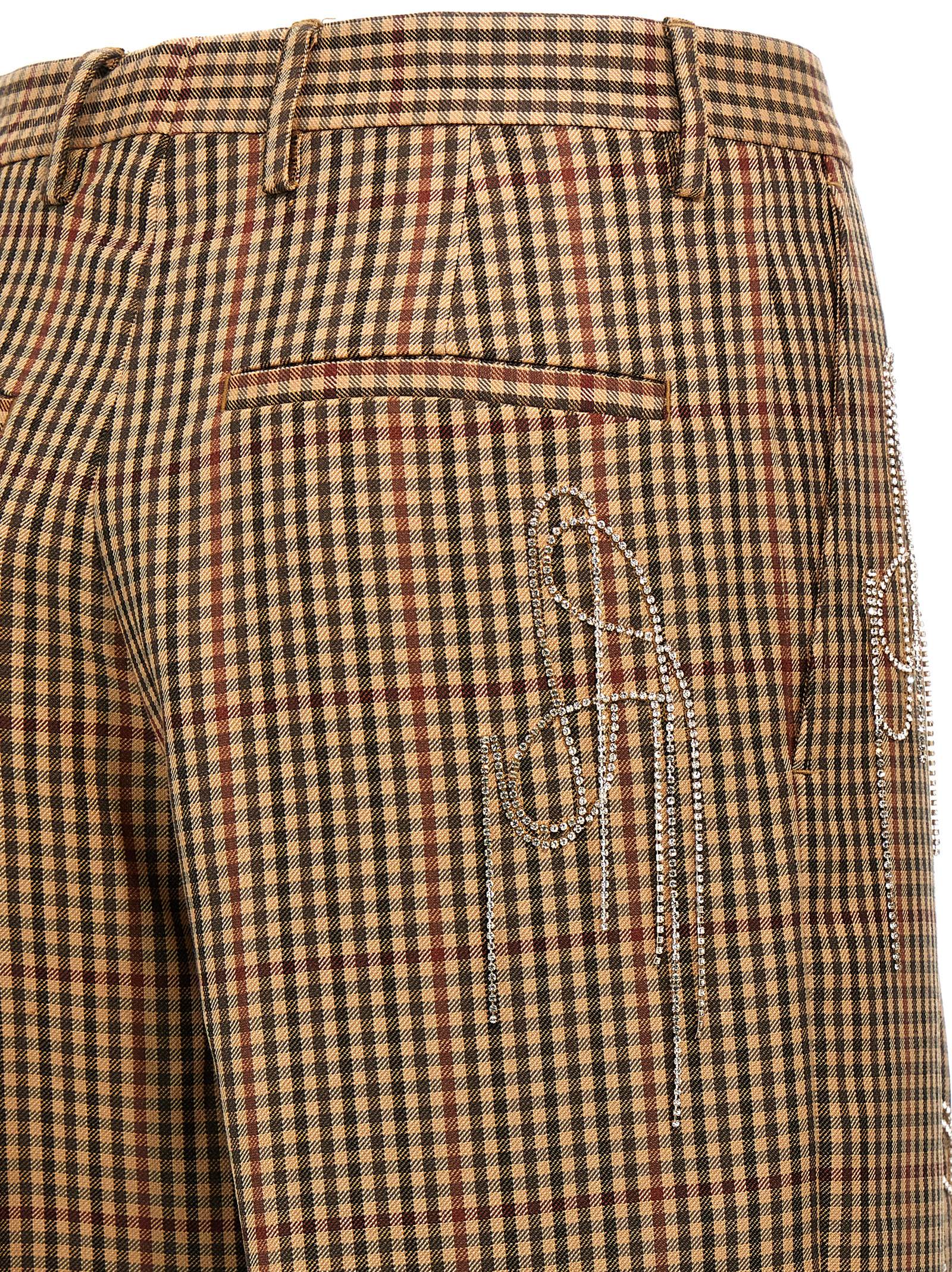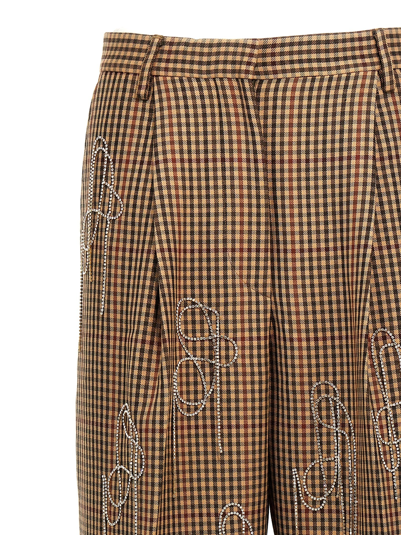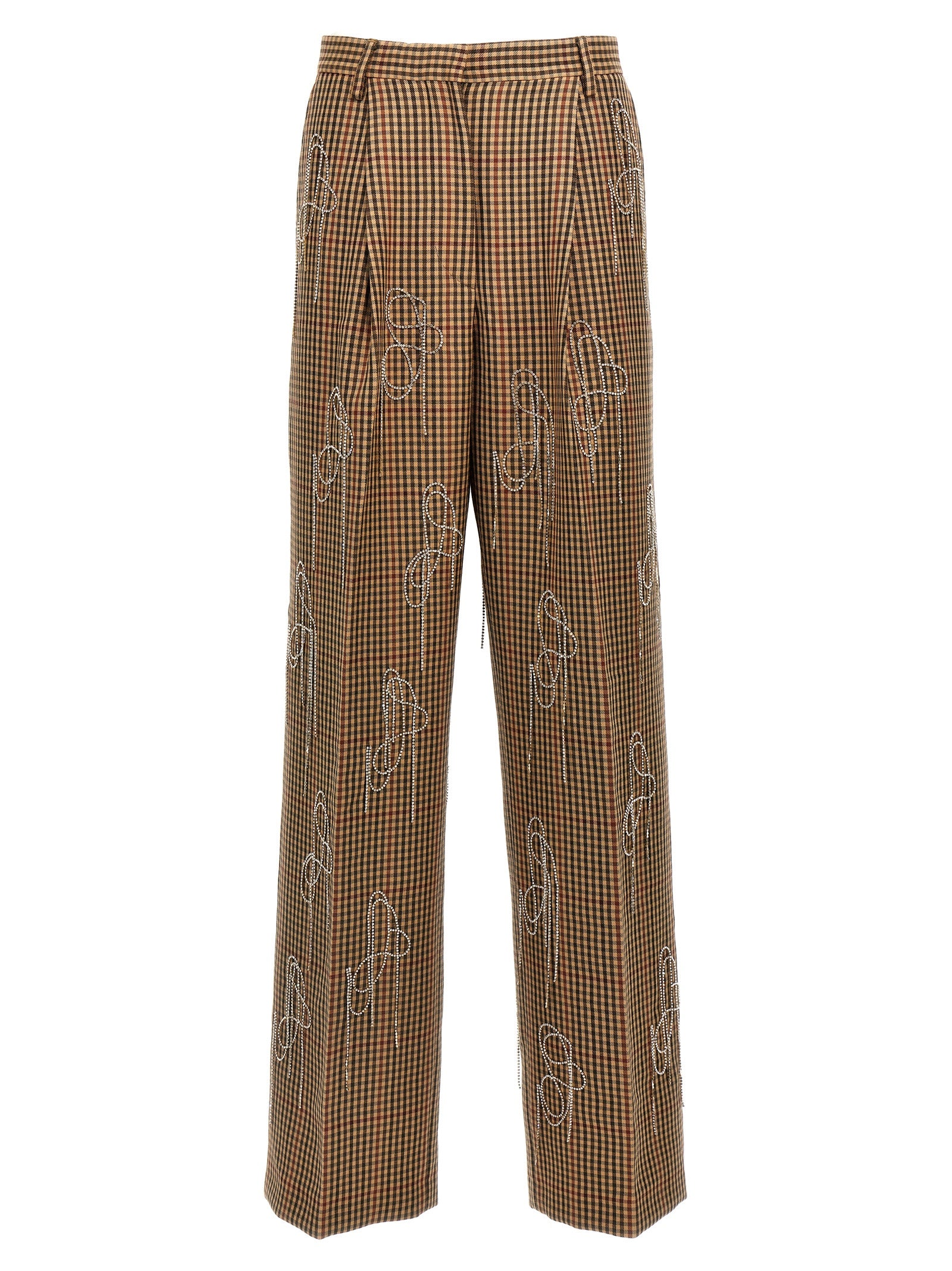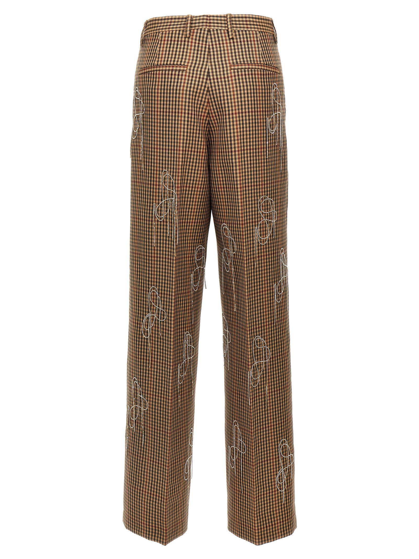 'Porter' Kontrollera utskriftsullbyxor, Rhinestone Pendant Appliqué, krok- och knapptäckningsstängning, fickor, breda ben med stiftstoppar och strykade veck.