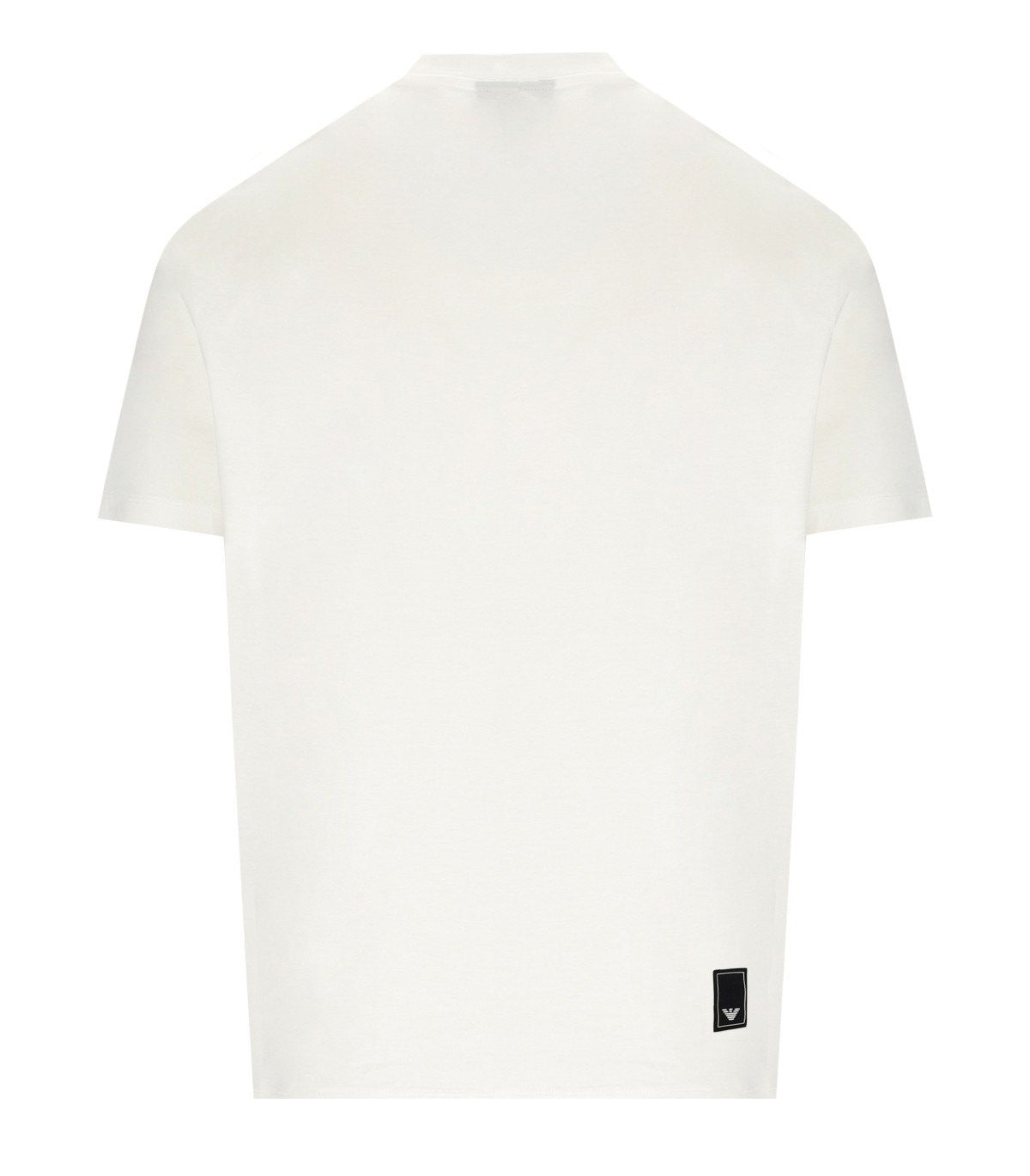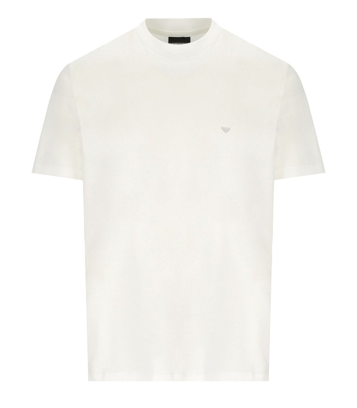 Emporio armani t-shirt gjord av bomullströja i vitt. En del av Travel Essential-linjen, den har en klassisk besättningshals och är prydd på bröstet med en ton-på-ton Micro Eagle-logotyp. Dekorerad på baksidan av plagget med en sydd logotyp. Färdig med ribbad detaljering på besättningshalsen. Regelbunden passform. Komposition: 100% bomull.
