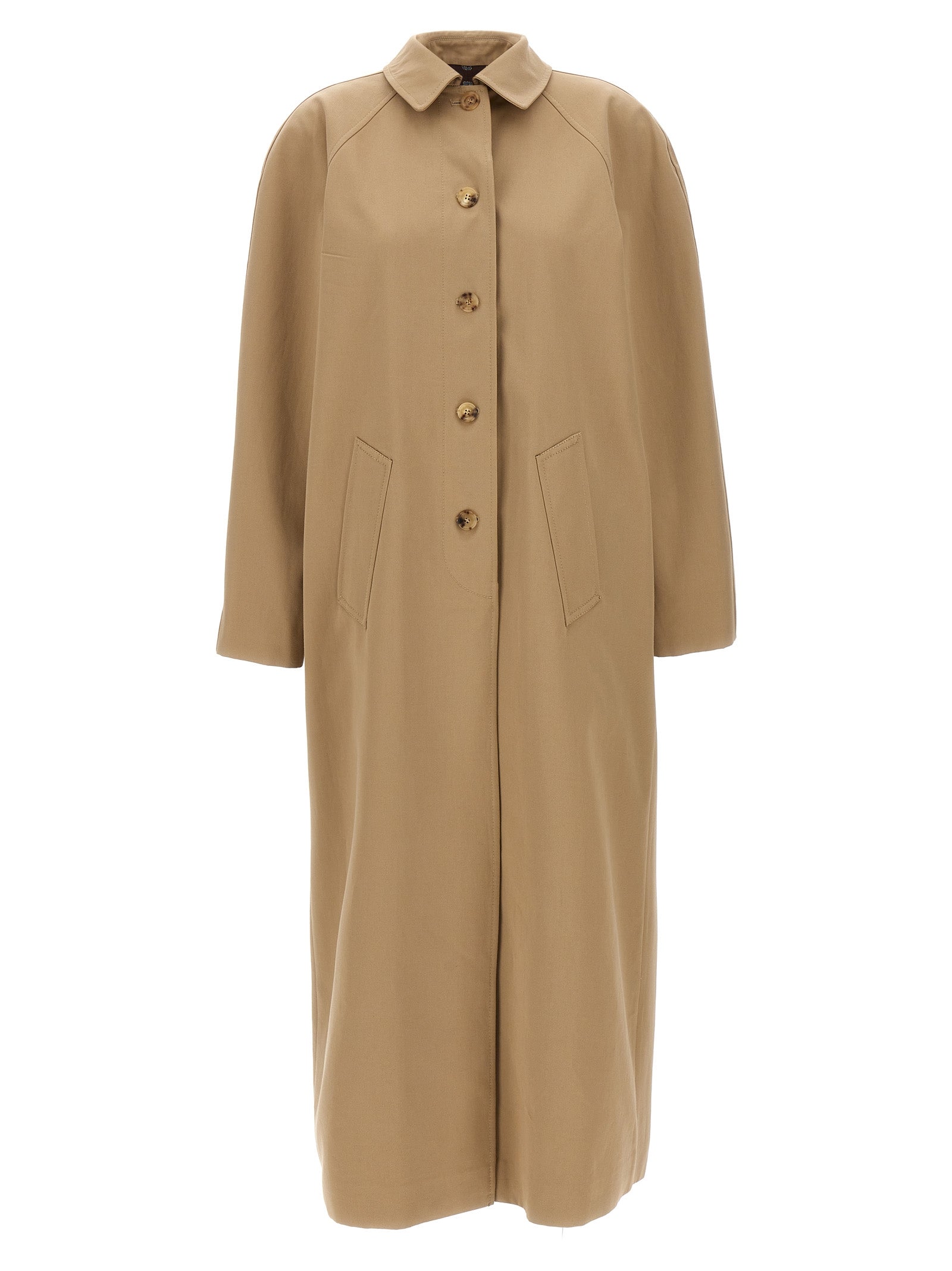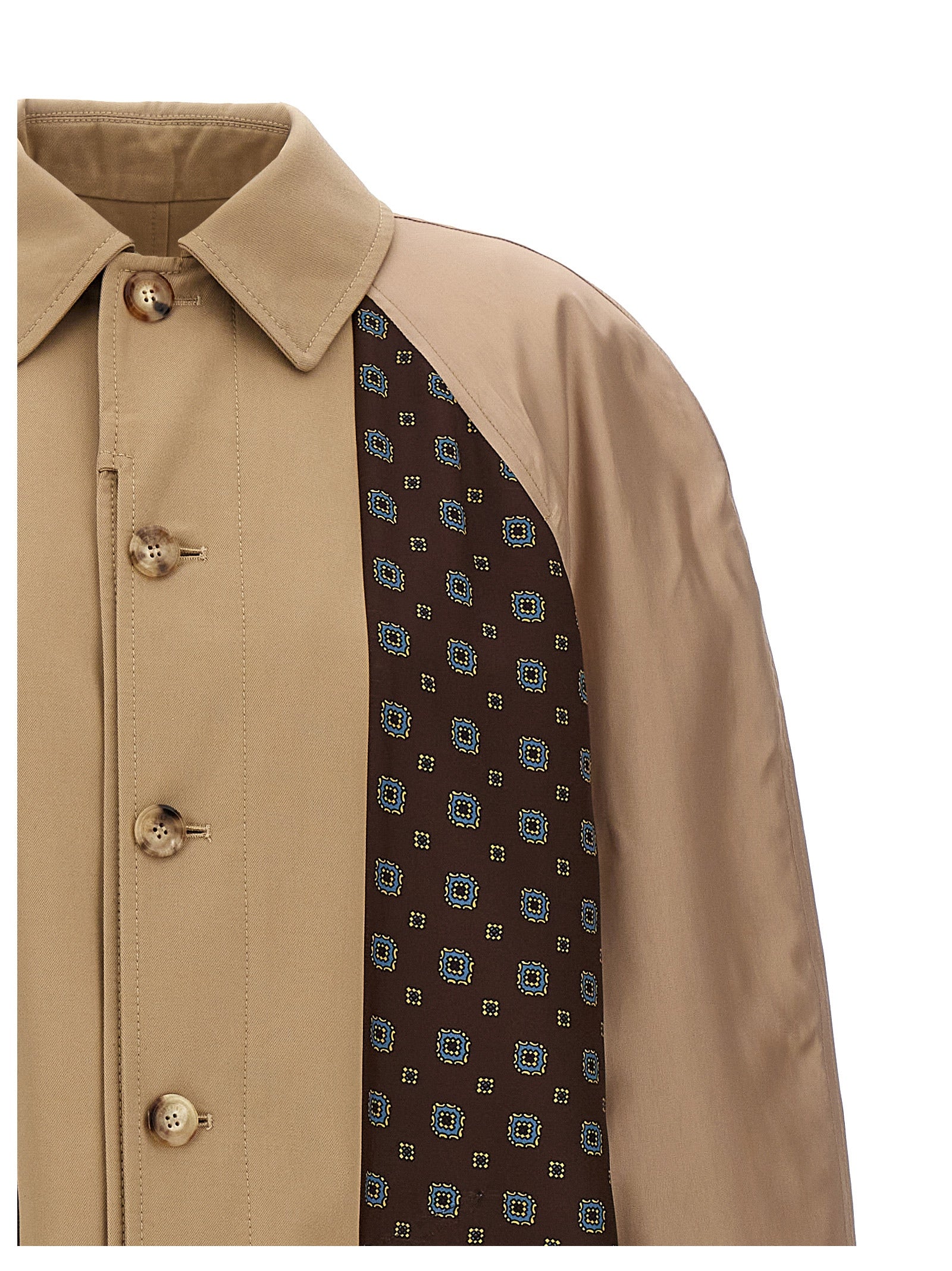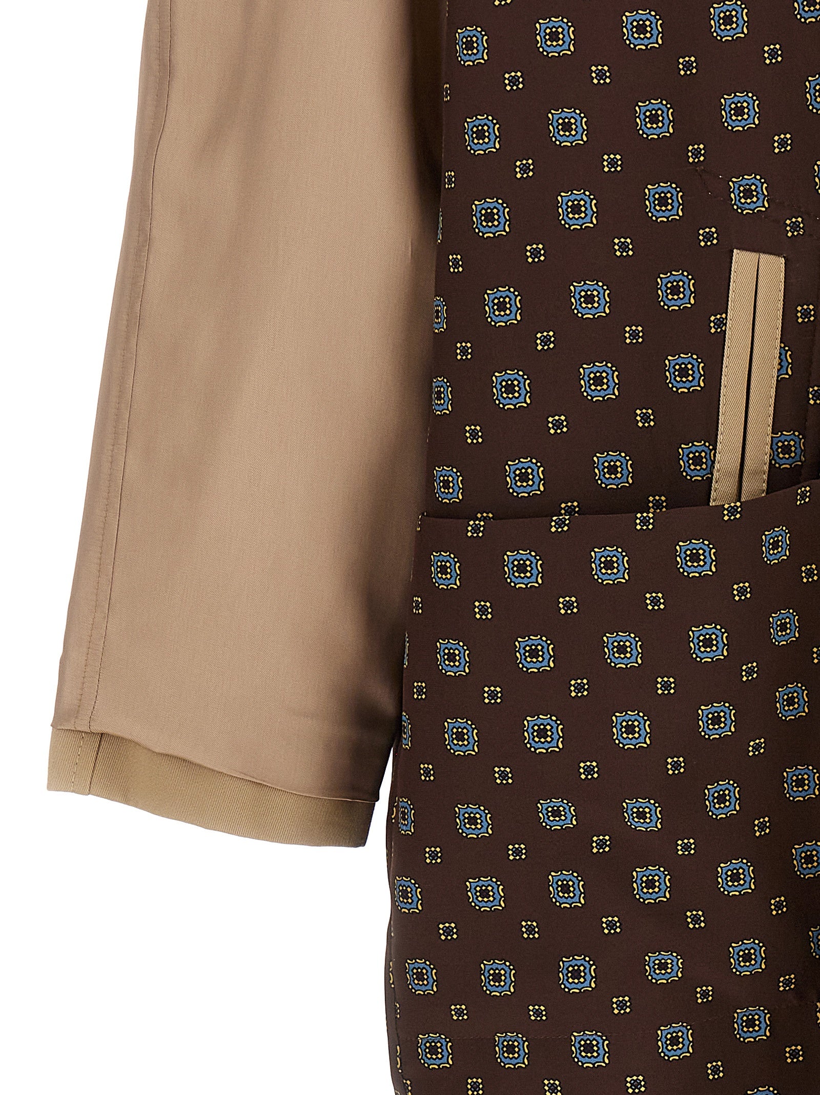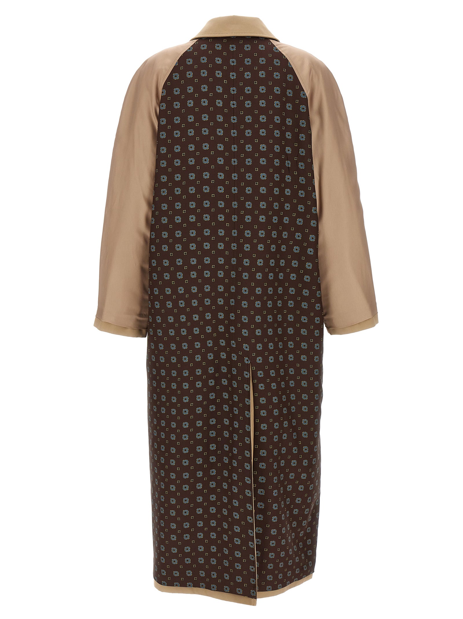 Långt dukgravrock med mönstrade trycksilkeinsatser, knappstängning, fickor, långa ärmar, rygg split.