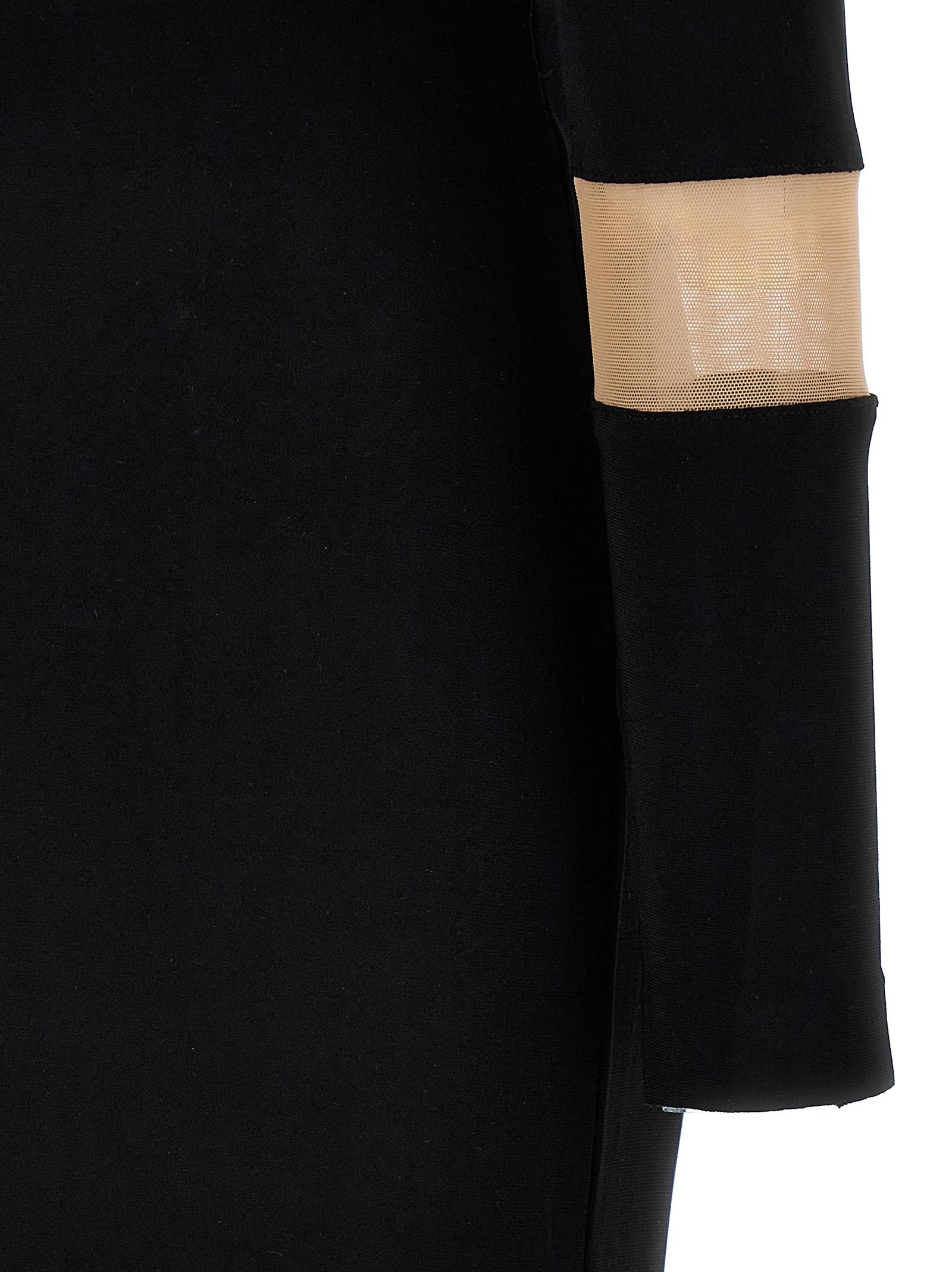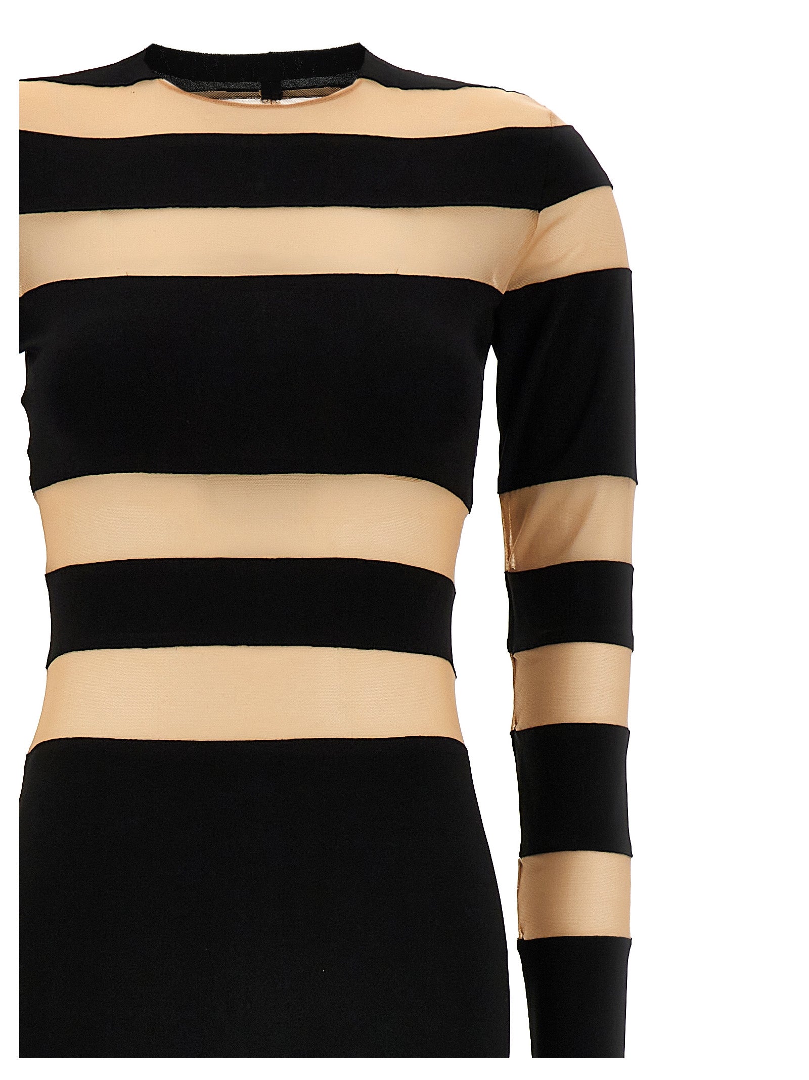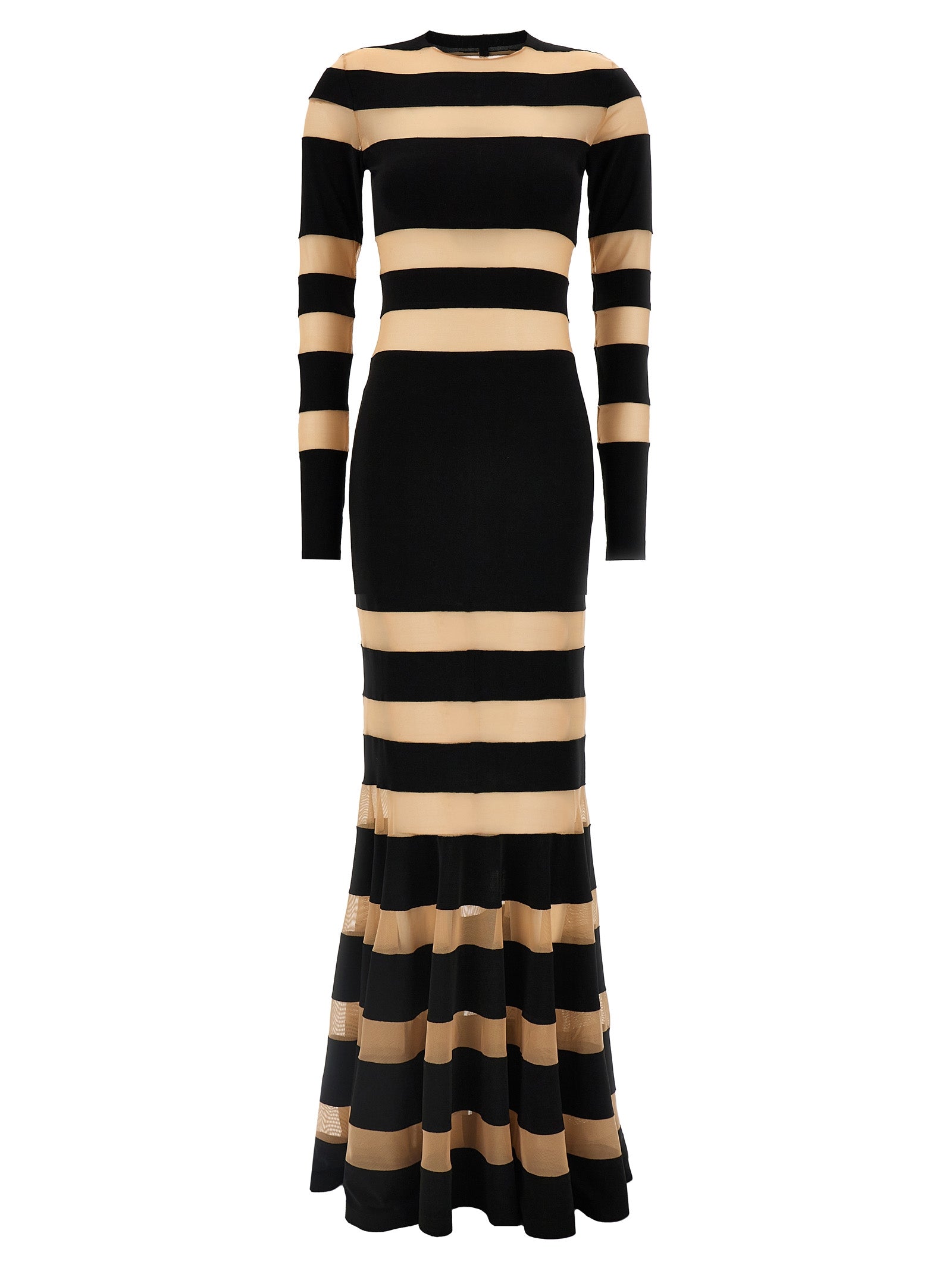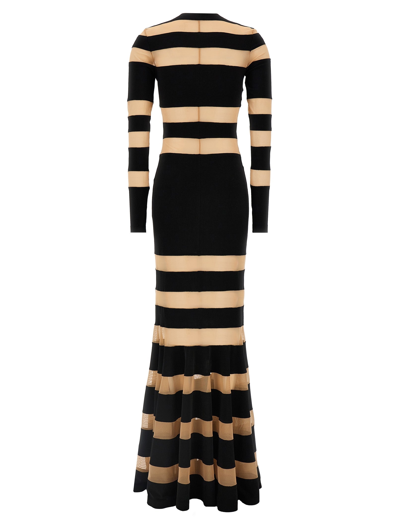 'Spliced Dress Fishtail Gown' 4-way stretch poly lycra dress transparent stripes and stripes in matt stretch jersey, crew neck, long sleeves, mermaid skirt, raw cut hem.