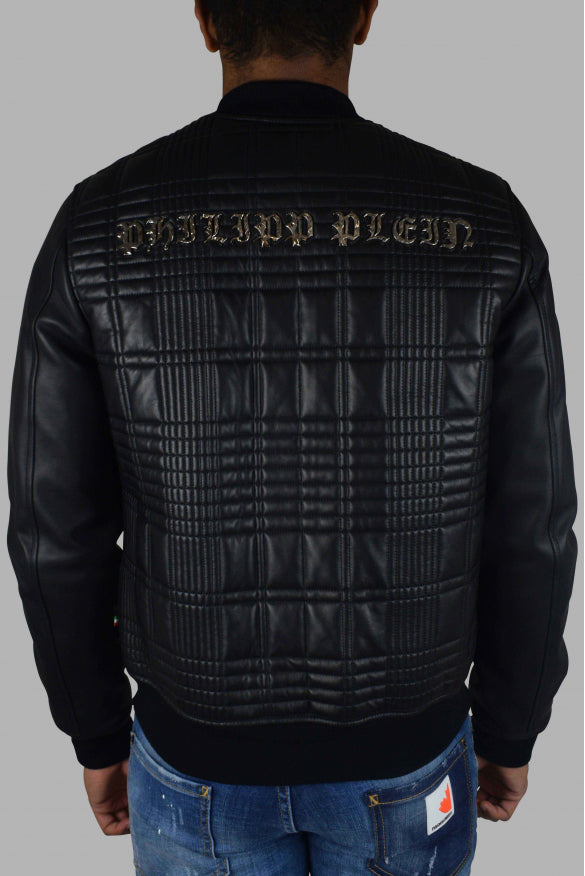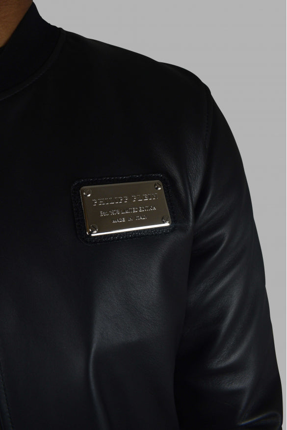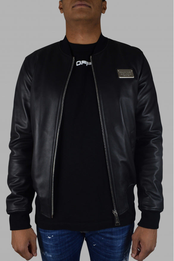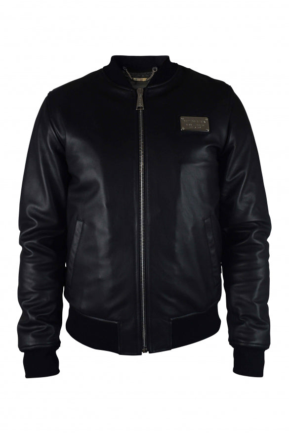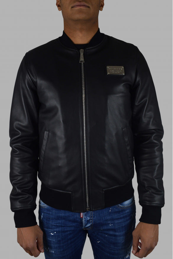 Philipp Plein Black Leather Bomber Jacket med dragkedja.