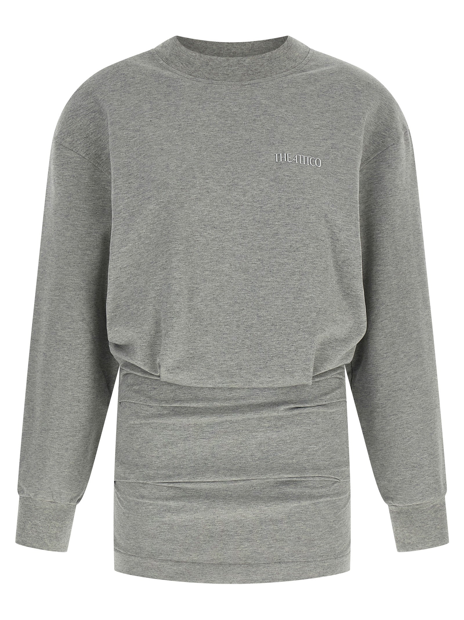 Borstad bomullsklänning, överdimensionerad tröja och draperad minikjol, ton-på-ton metalllogotyp på framsidan, besättningshals, långa ärmar med manschetter.