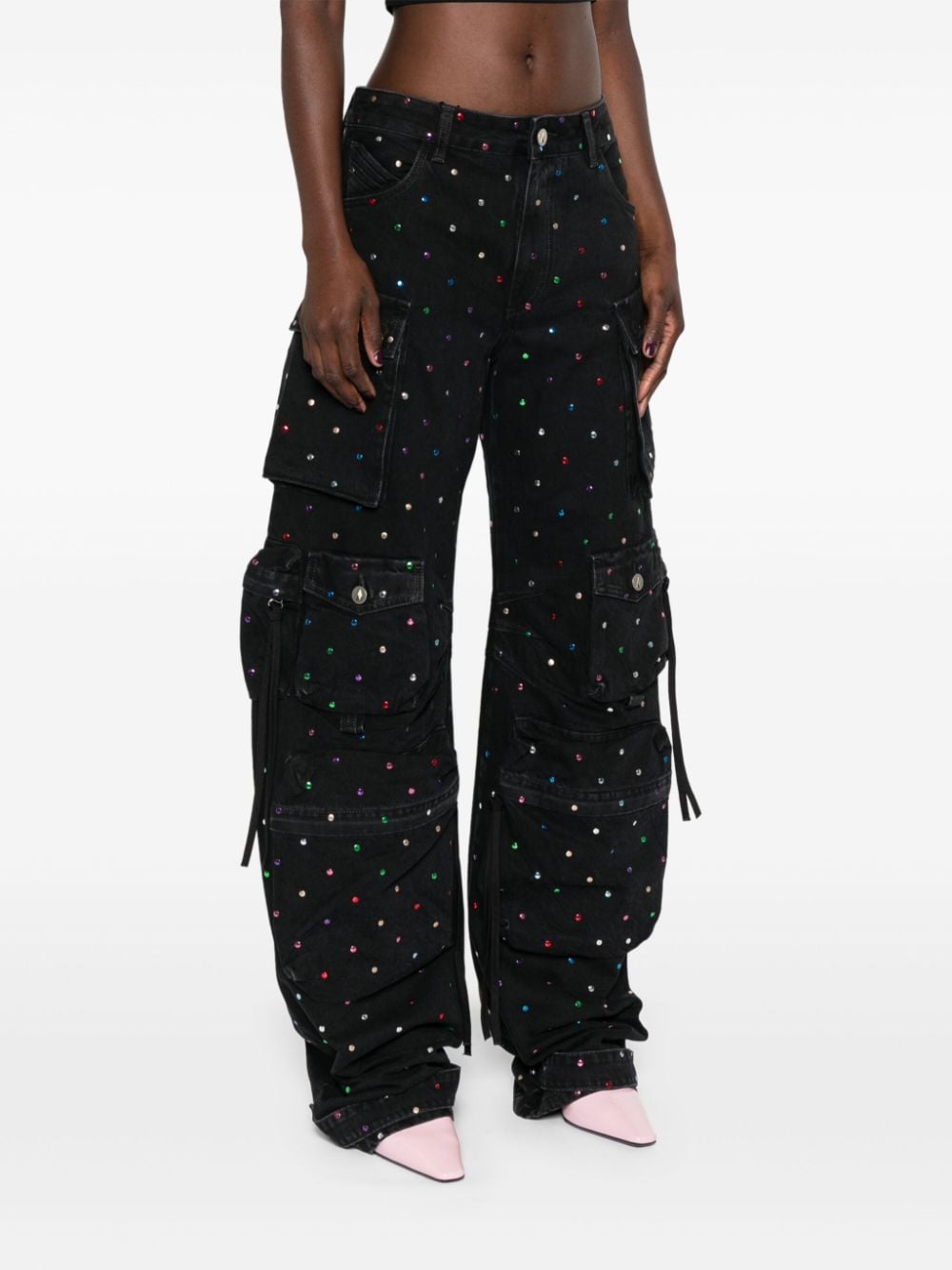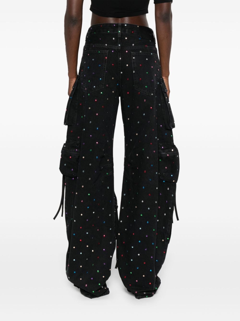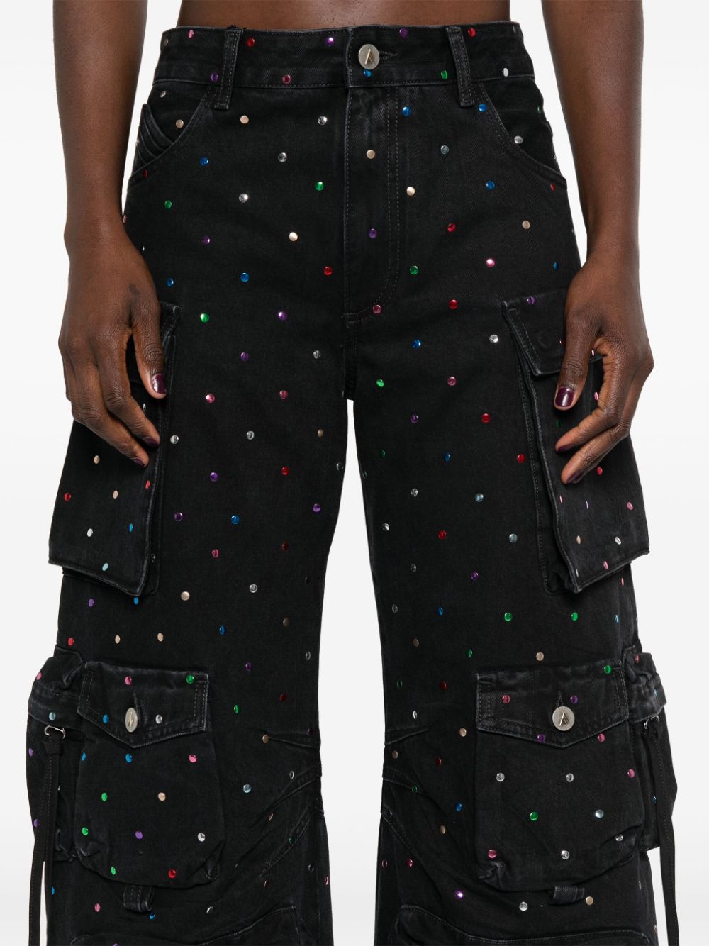 Black Cotton Denim Multicolour Stud Embellation Belt Loops Classic Five Pockets flera lastfickor i full längd och pressstudentfästning till ankellogo-lappen till den bakre breda benfronten dolda zip-fly och knappfästning