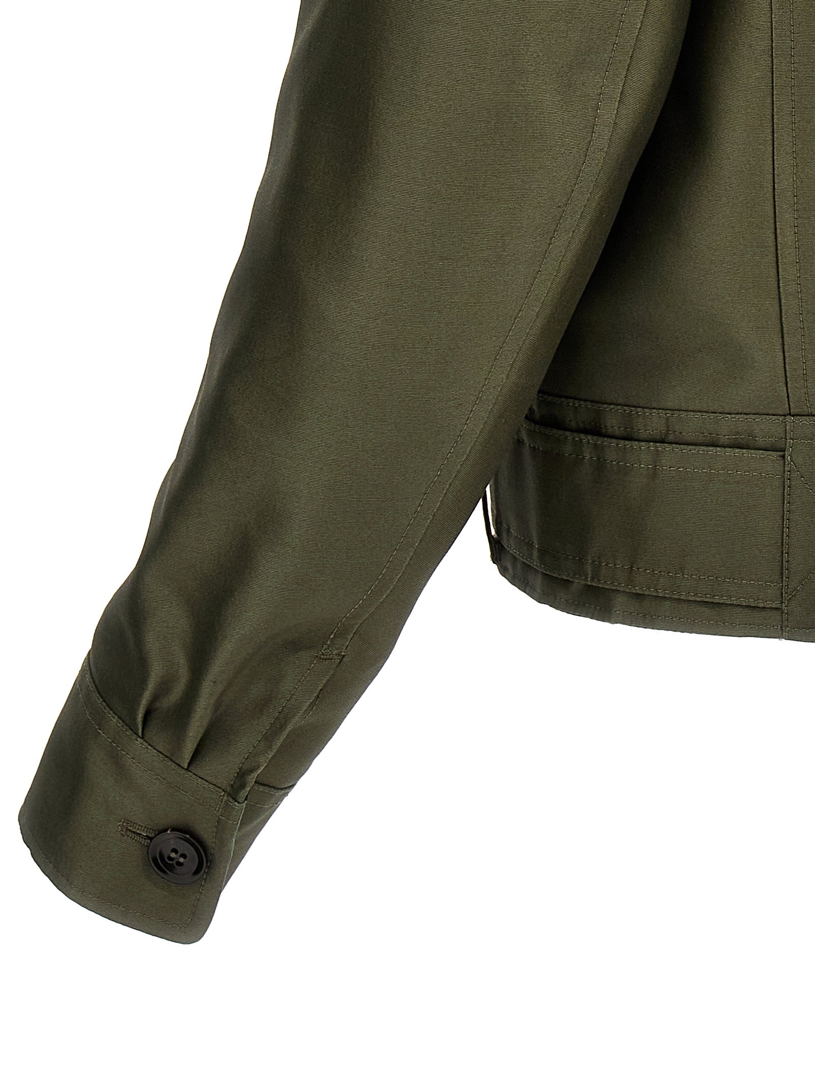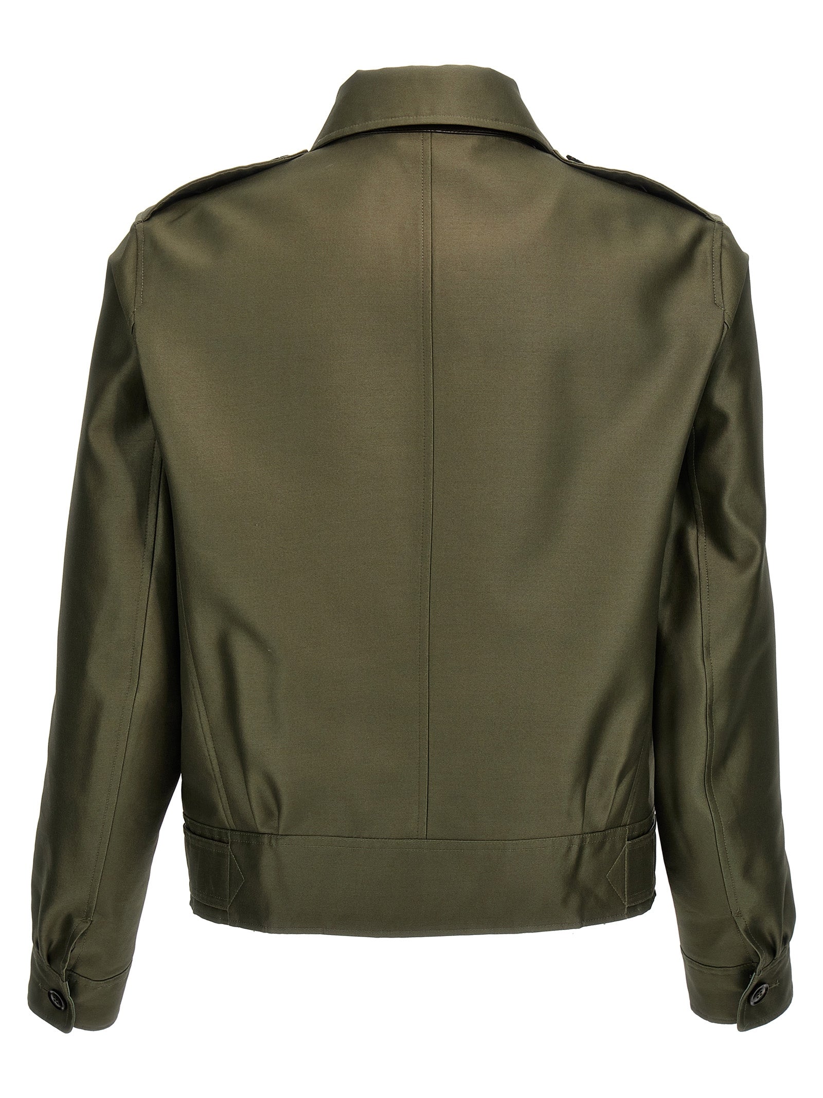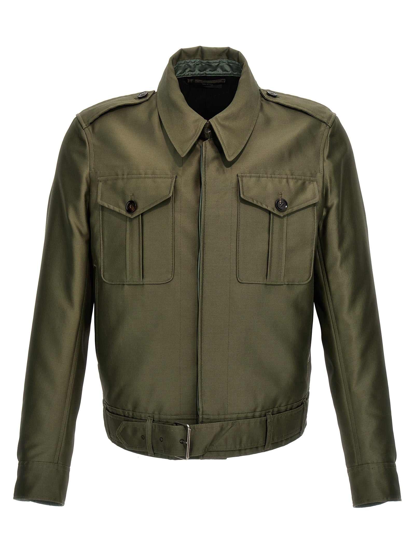 "Battle" -jacka i ull och sidenfaille med knappstängning, fickor, långa manschetterade ärmar, läderdetaljer, justerbart midjebälte.