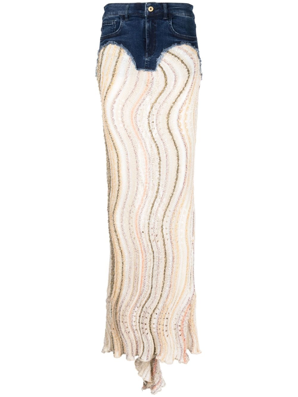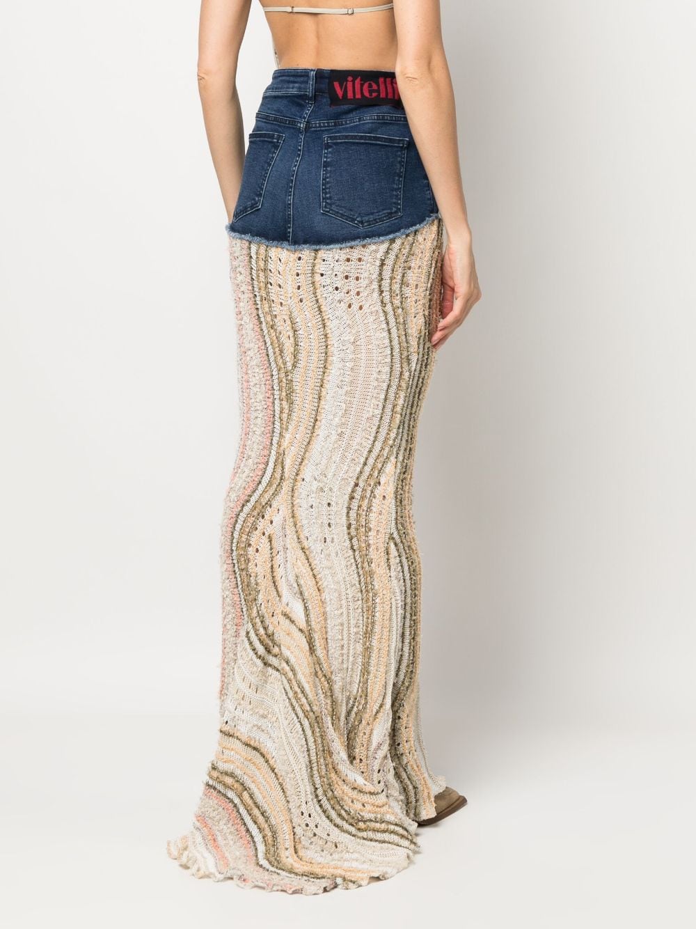 Stickad-panel maxi kjol från Vitelli med stickade paneler, logotyp på baksidan, bälteslingor, frontknapp och zip-fästning, klassiska fem fickor, lång längd, lätt beige, indigoblå, bomull och linne.