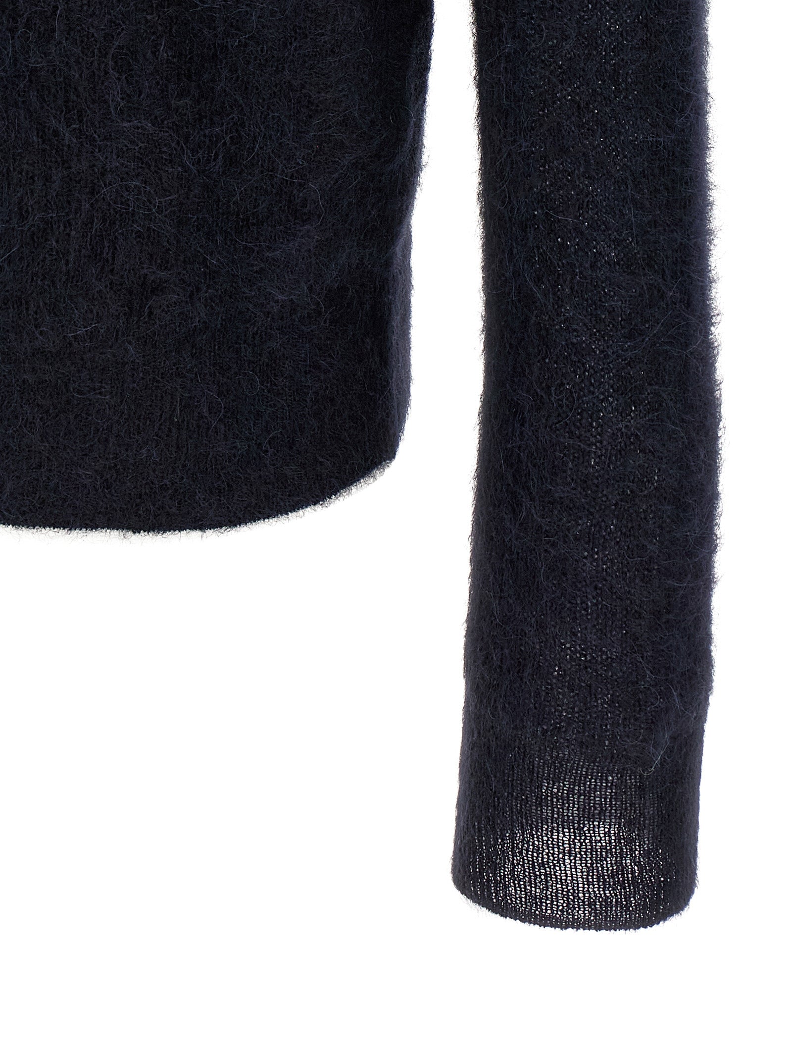 Polo 衫,采用珍贵的 tam 纱线制成,采用稀有的苏里小羊驼毛制成,V 领、立领、长袖、袖口和落肩。