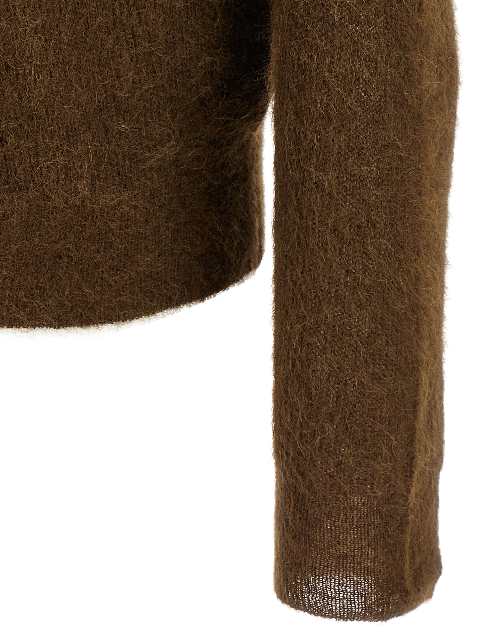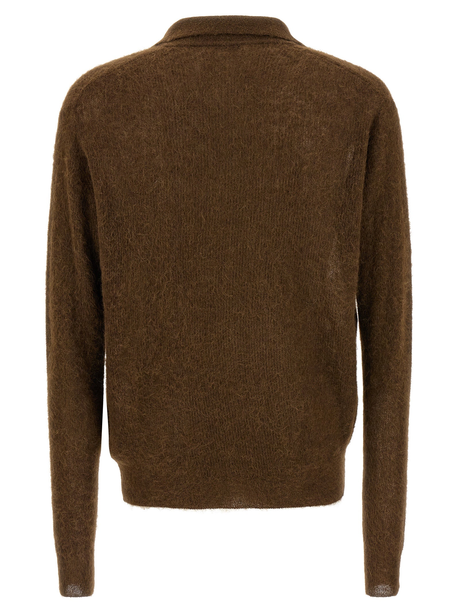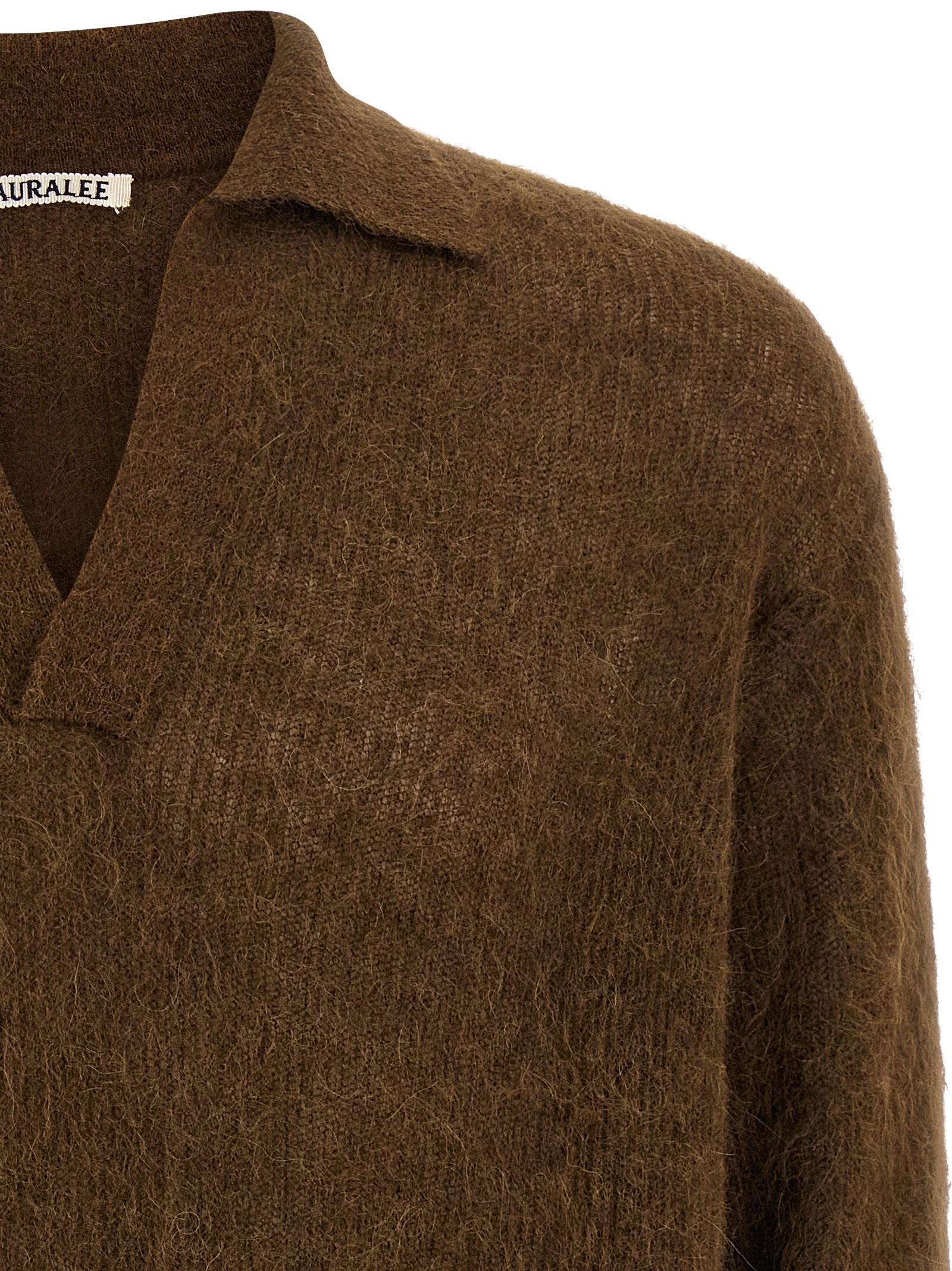 Polo 衫,采用珍贵的 tam 纱线制成,采用稀有的苏里小羊驼毛制成,V 领、立领、长袖、袖口和落肩。