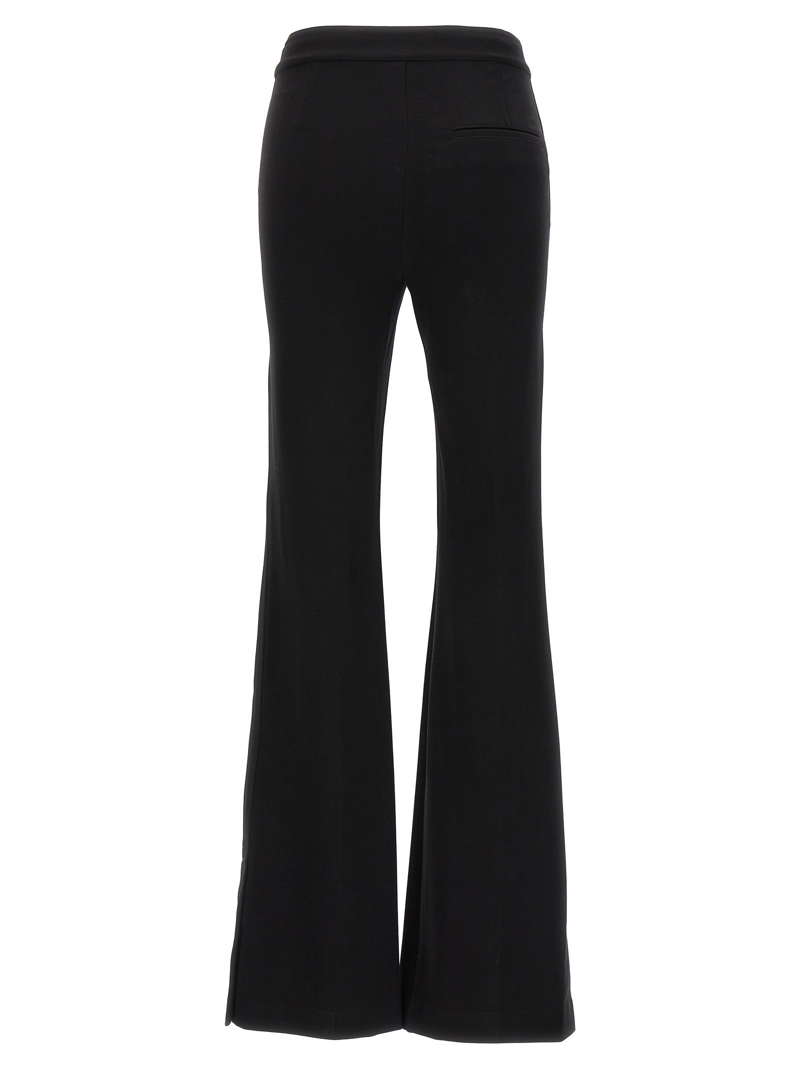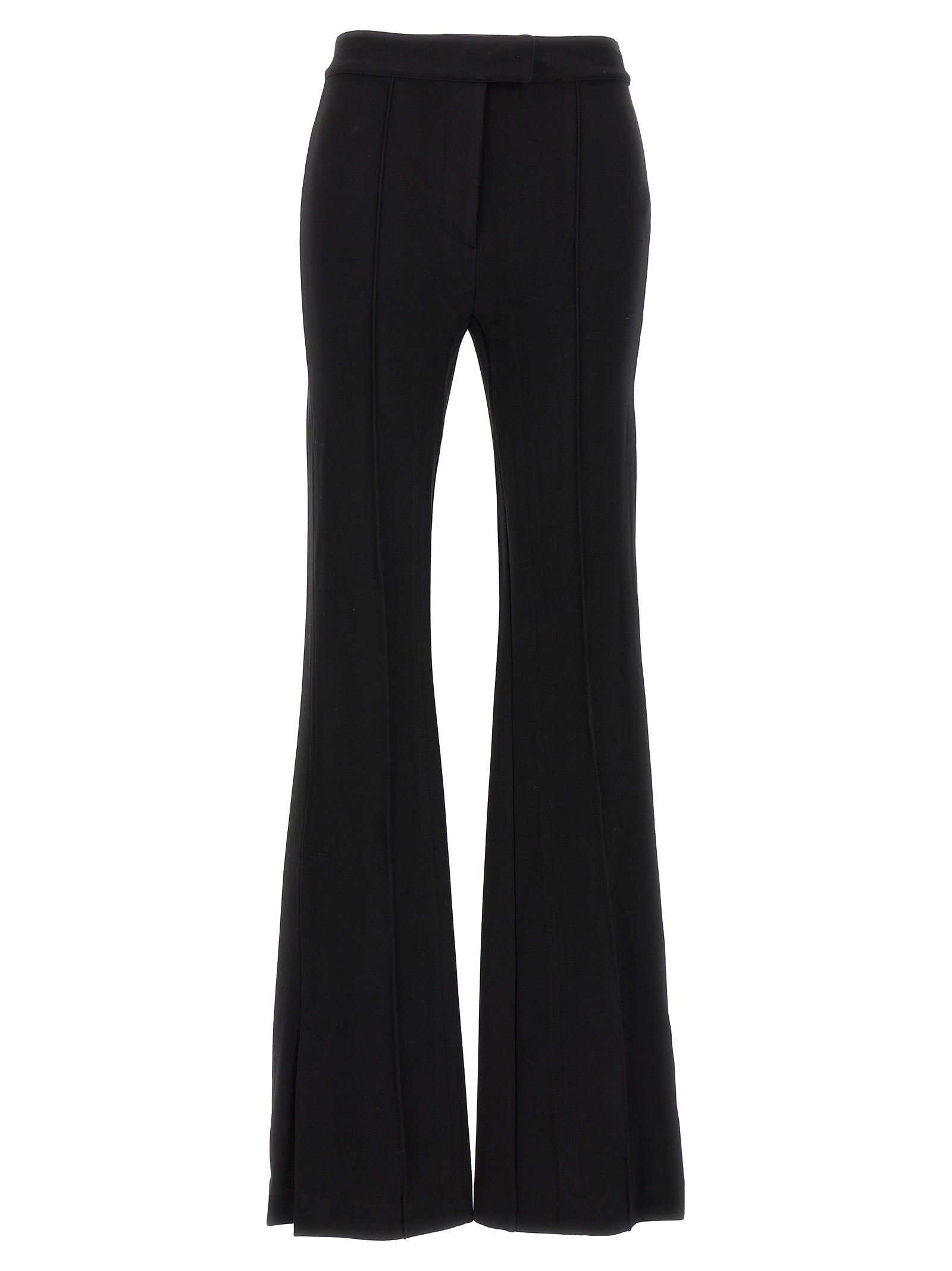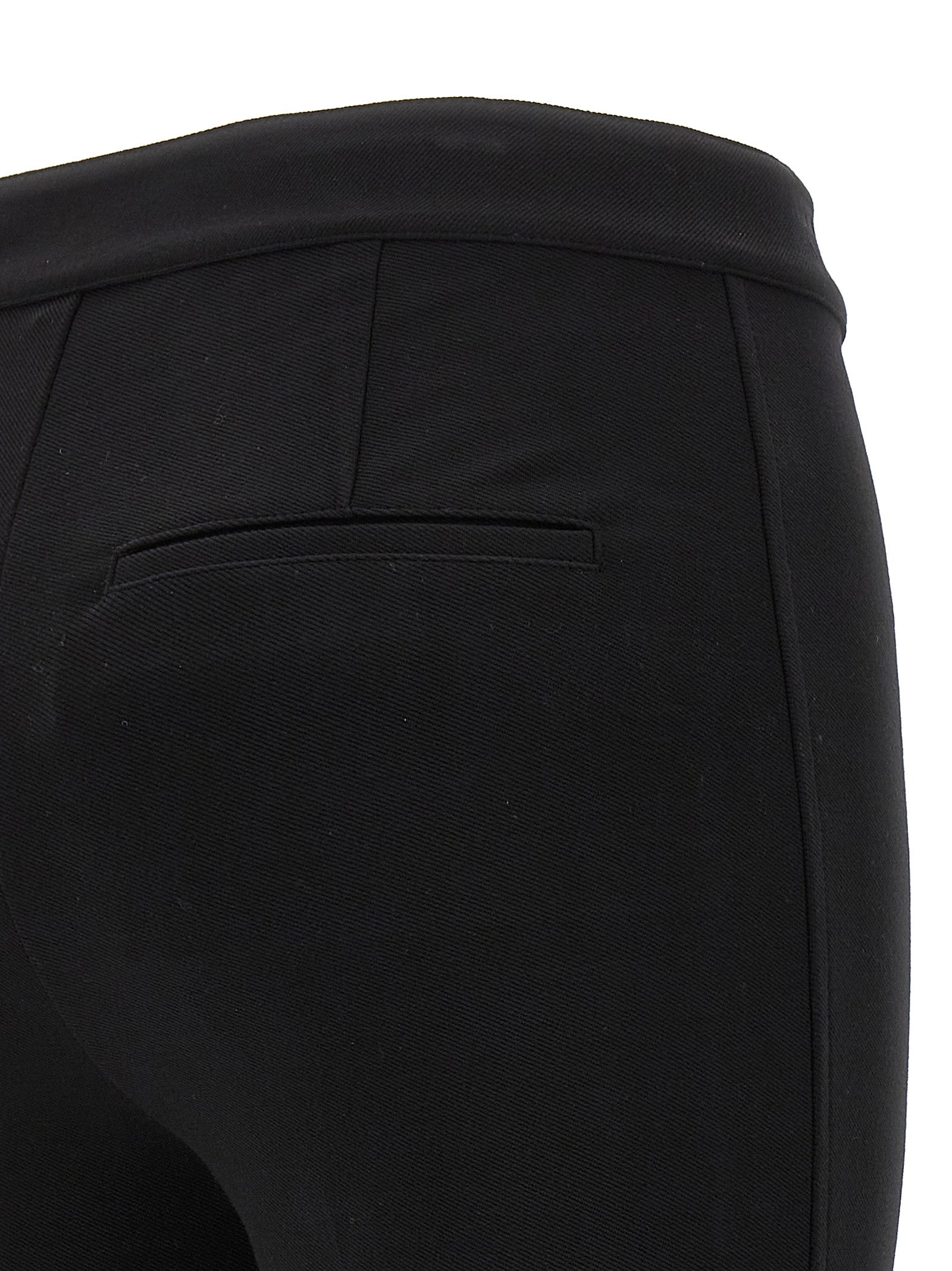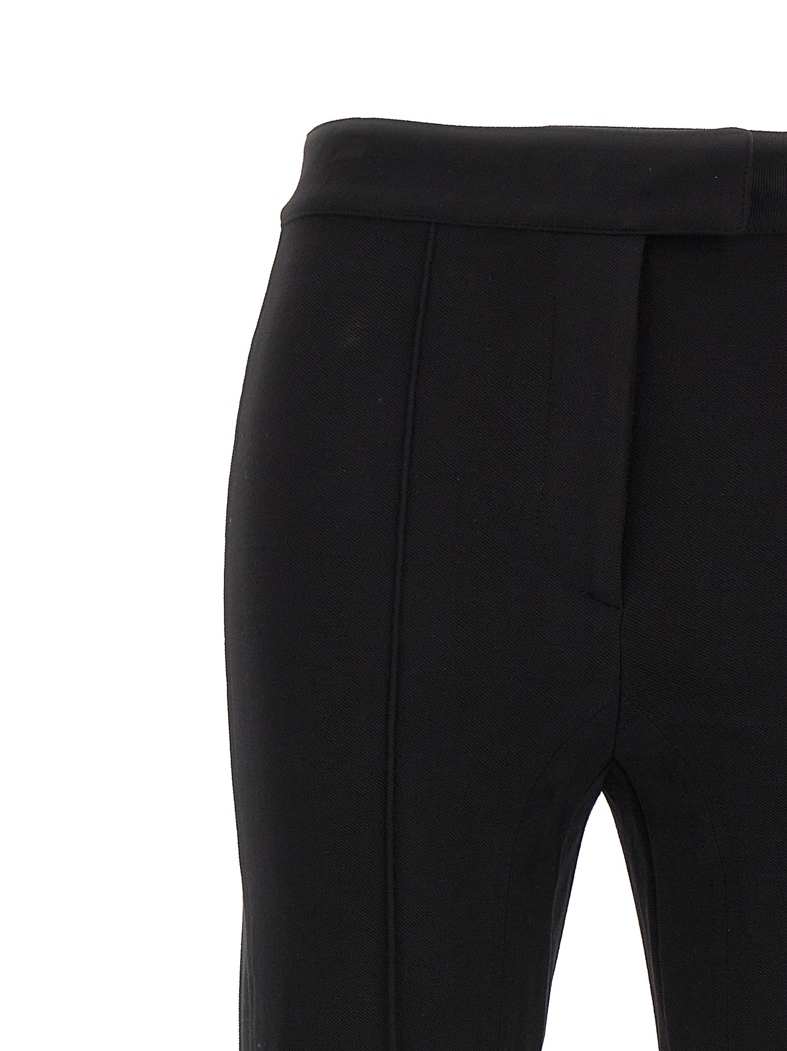 拉伸粘液针织裤,略微耀斑的腿在脚踝,中央缝制的褶细节,拉链和纽扣闭合。