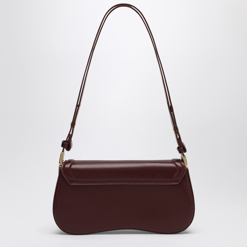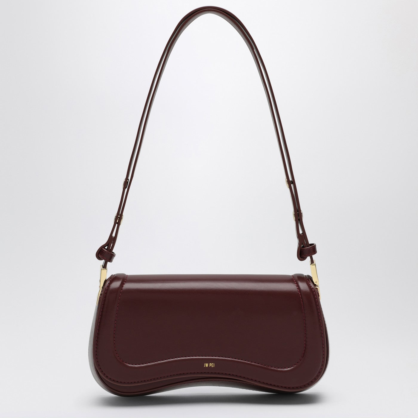 JW Pei's bordeaux vegan leather shoulder bag, featuring a flap closure with double magnetic button, adjustable shoulder strap, one flat internal pocket, front logo lettering, and gold-colored metal hardware.