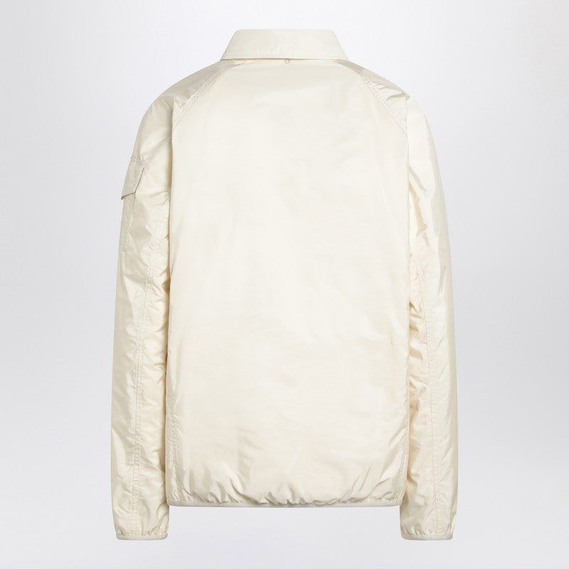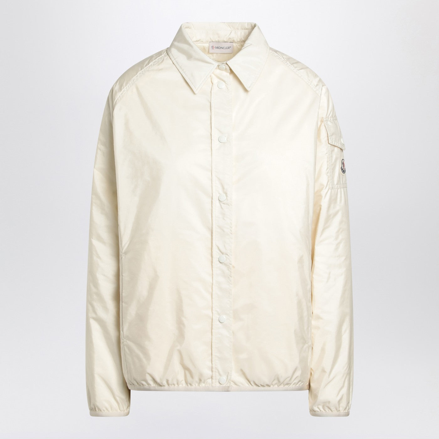 White nylon Moncler shirt jacket, characterized by a removable hood with drawstring, long sleeves with an applied flap pocket and logo patch, front closure with snap buttons and two side welt pockets.