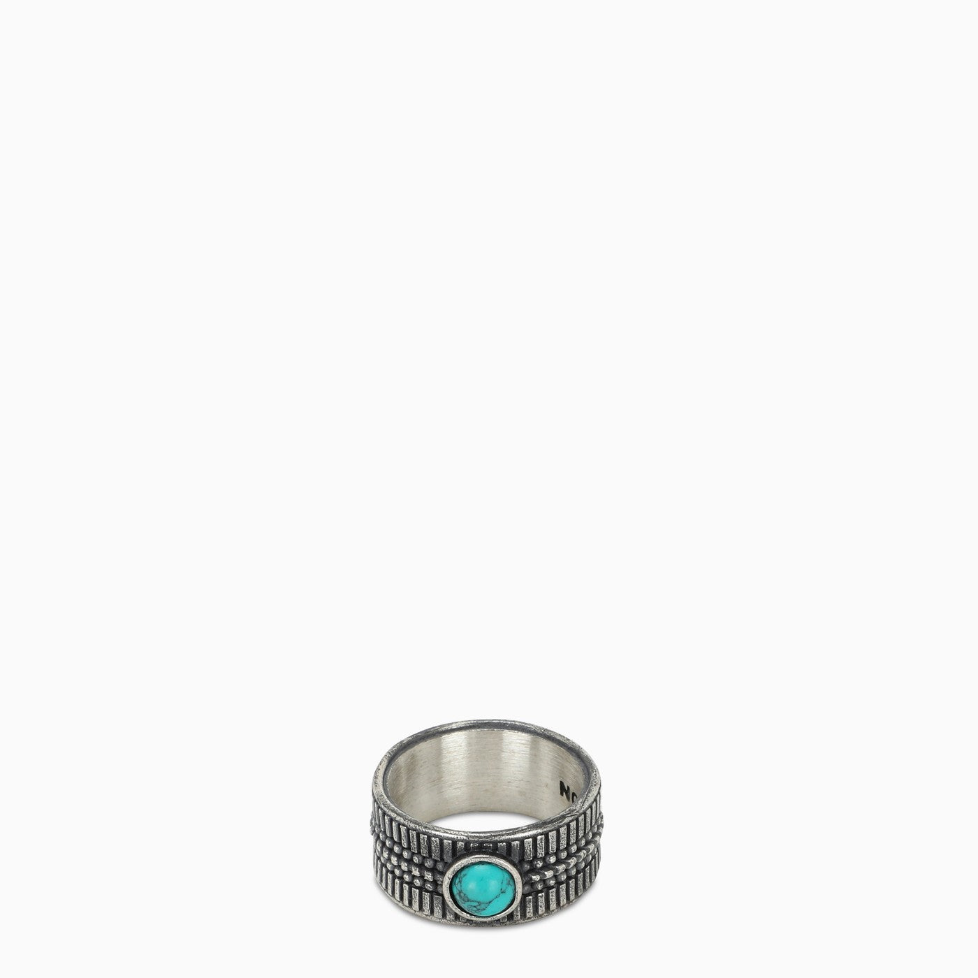 在磨光的纯银925中响起的诺维25戒指,带有乐队和刚性设计,并带有几何雕刻细节和绿松石石插入物。