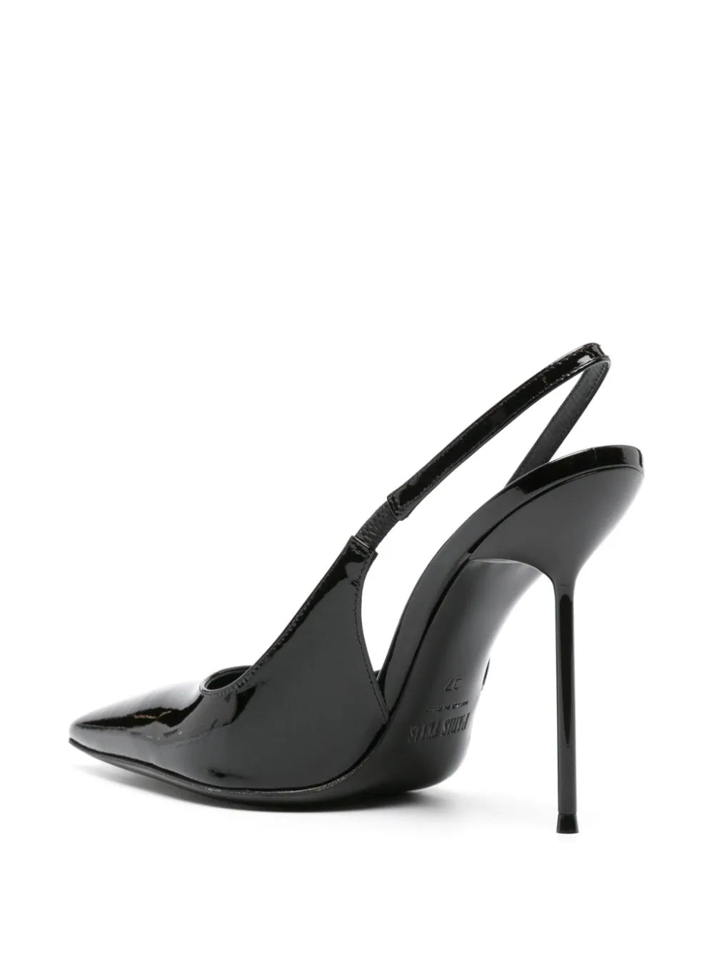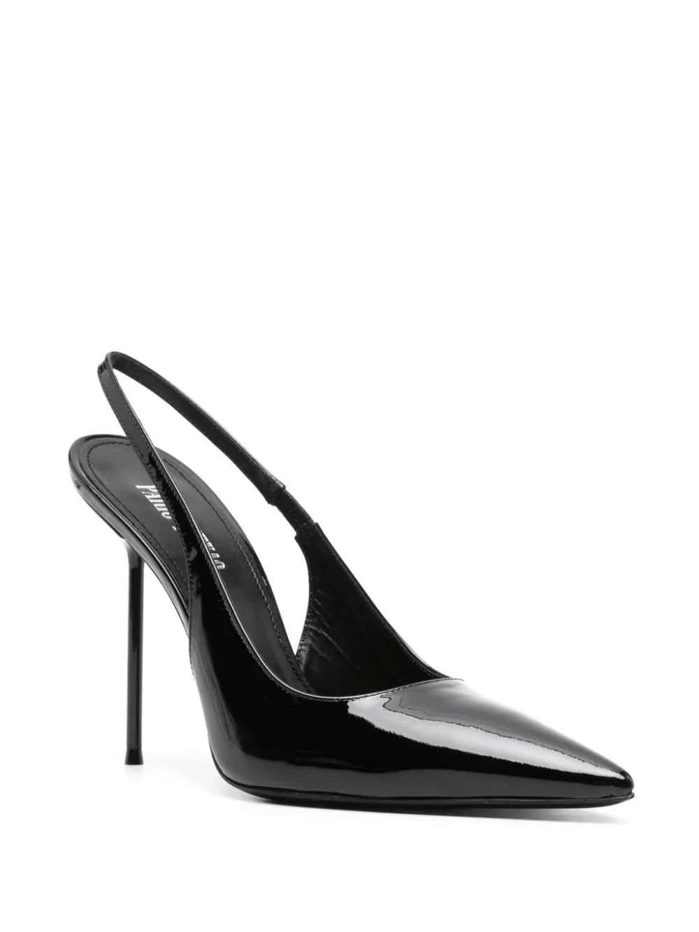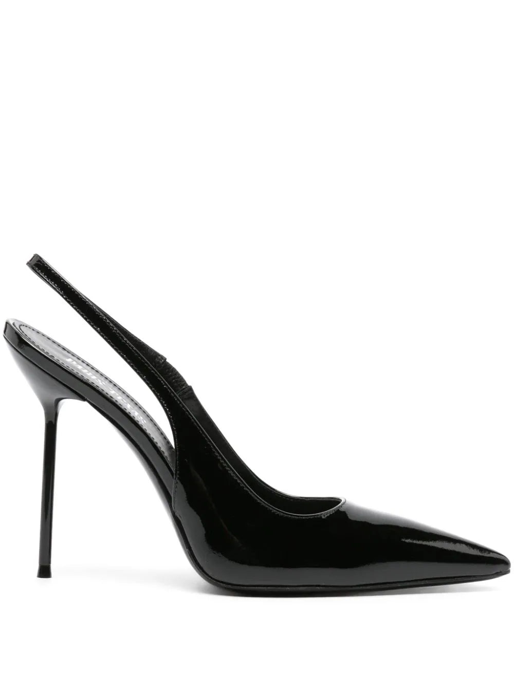 黑色,小腿,闪亮的饰面,尖锐的设计,弹性的鞋跟带,徽标鞋垫,高跟鞋高跟鞋和皮革鞋底。