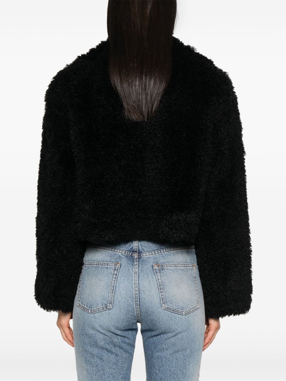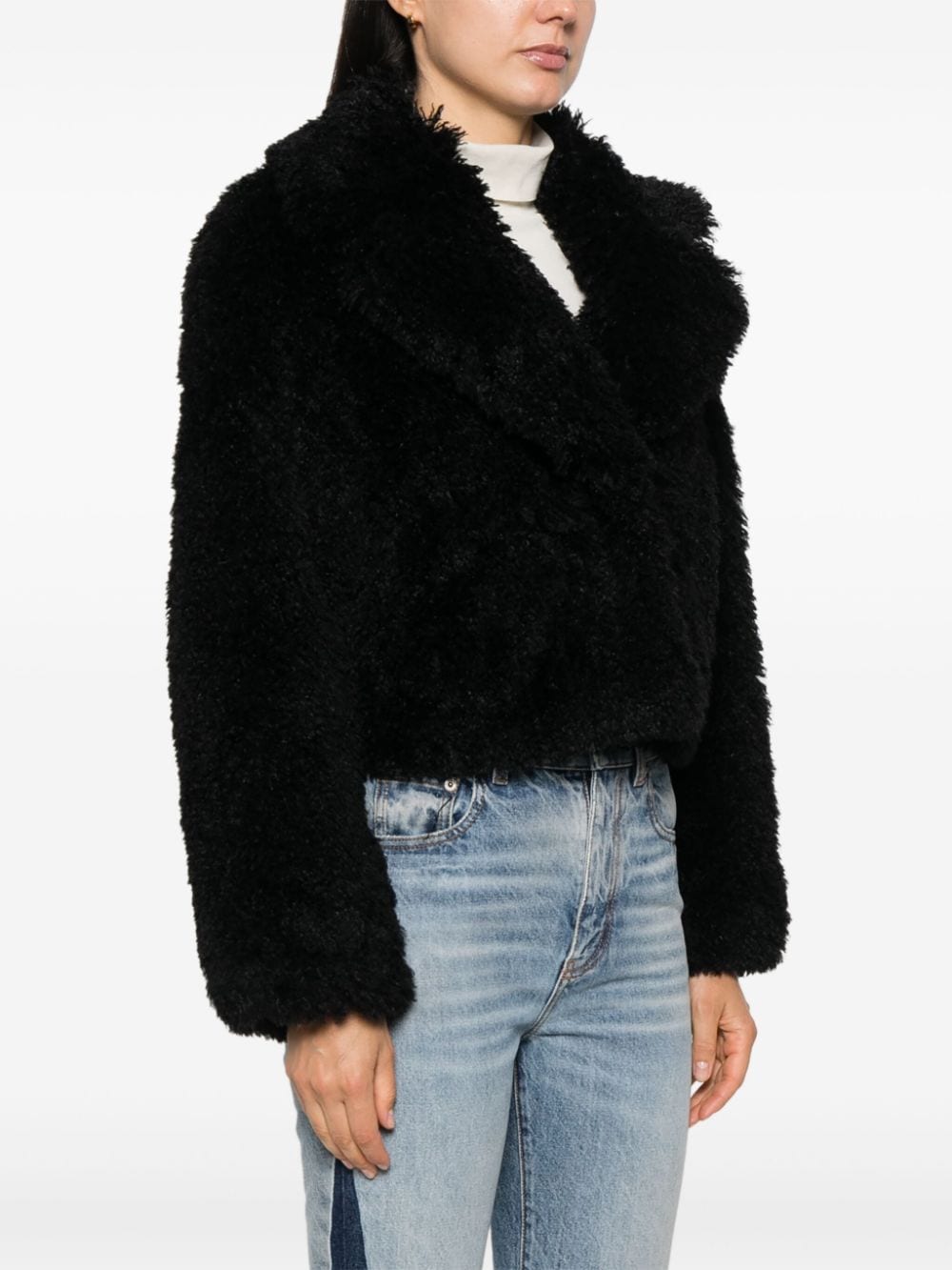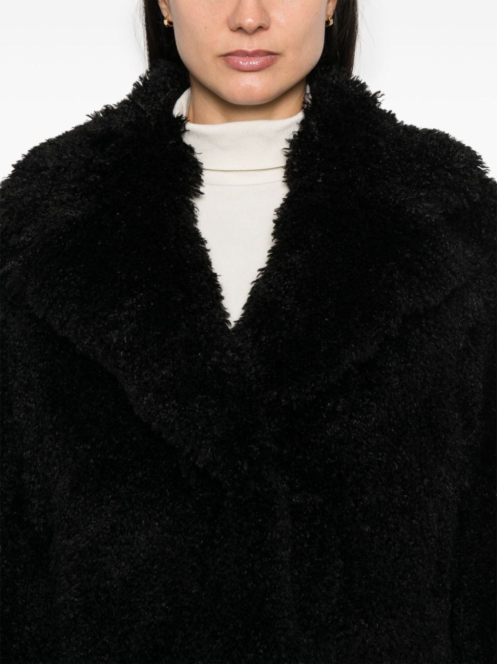 black faux-fur design front hook and eye fastening wide notch lapels long sleeves two side slit pockets faux suede lining straight hem