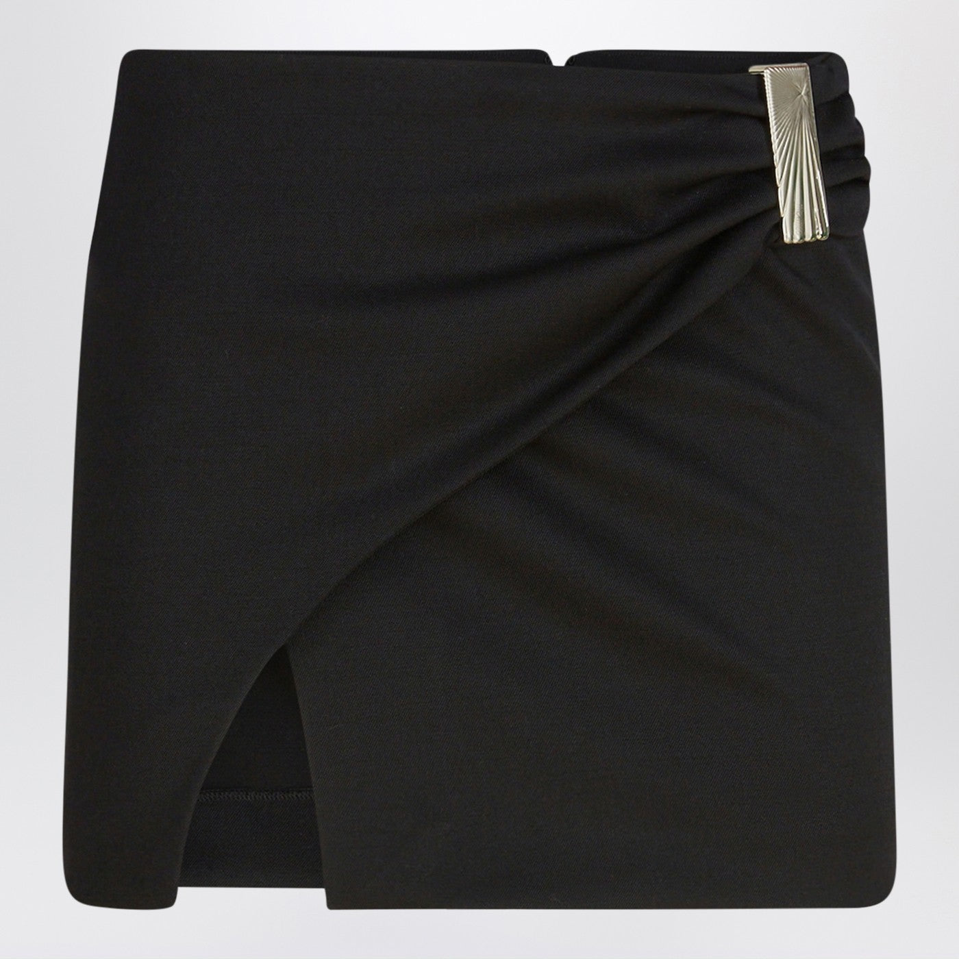 Mini skirt by The Attico in black stretch wool gabardine, featuring rear zip closure, crossed front design with logoed metal clasp, and front slit.