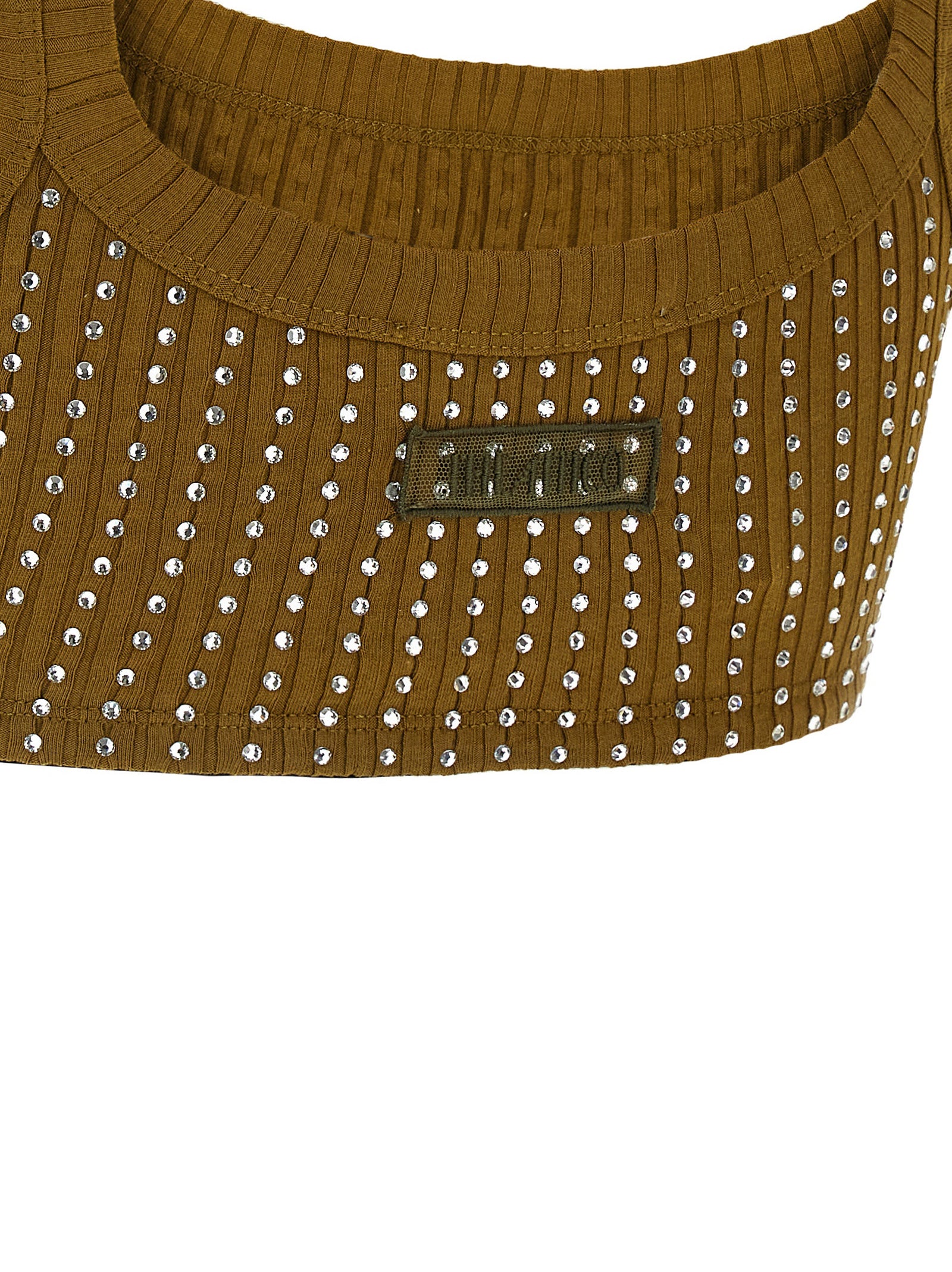 带有全面的水晶贴花,方形领口和后郁金香徽标贴片的肋棉球衣。