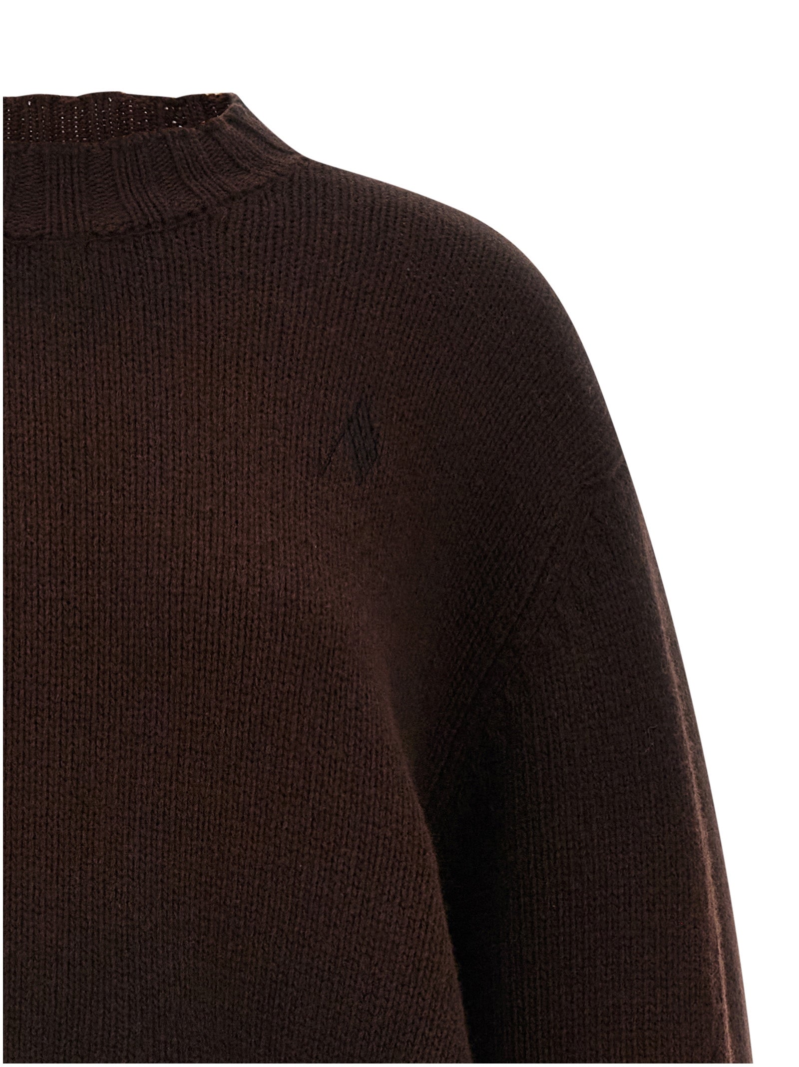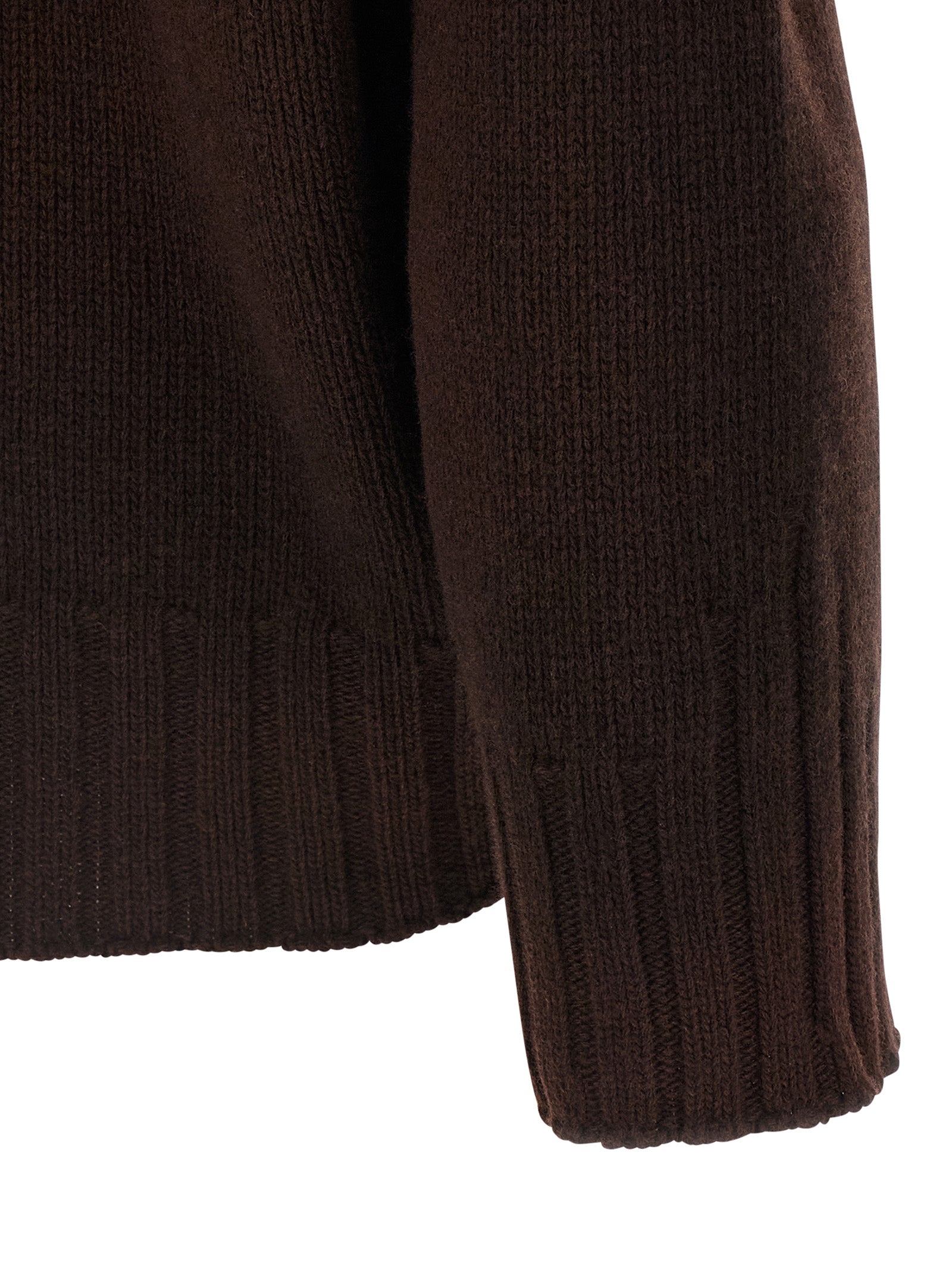 羊毛和羊绒混合毛衣,前面有音调徽标刺绣,船员脖子,长袖袖口和肩膀掉落的肩膀,不对称的下摆。