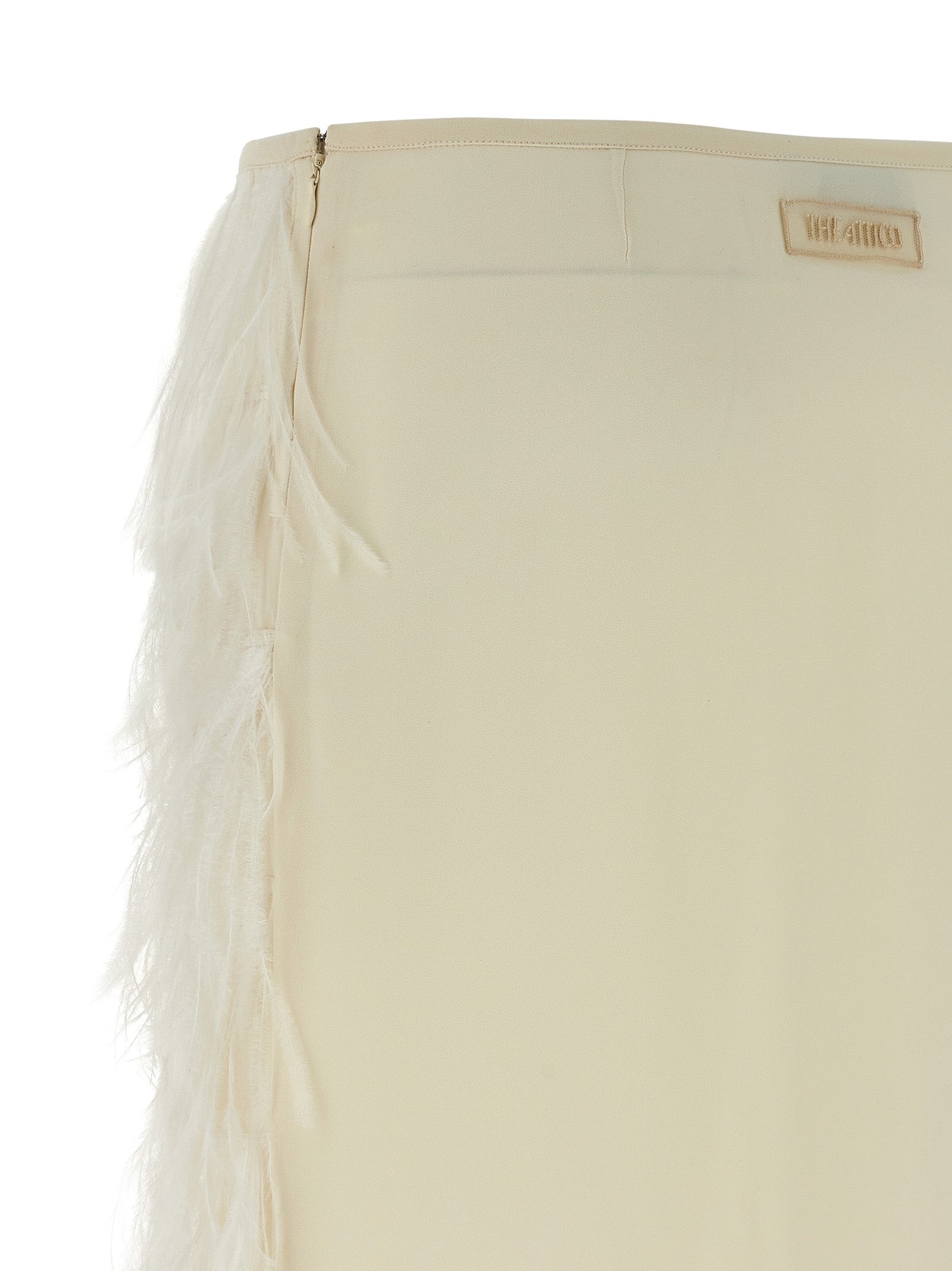 带有前鸵鸟羽毛的织物中裙裙,鞘裙,衬裙,侧拉链闭合,后徽标贴片。